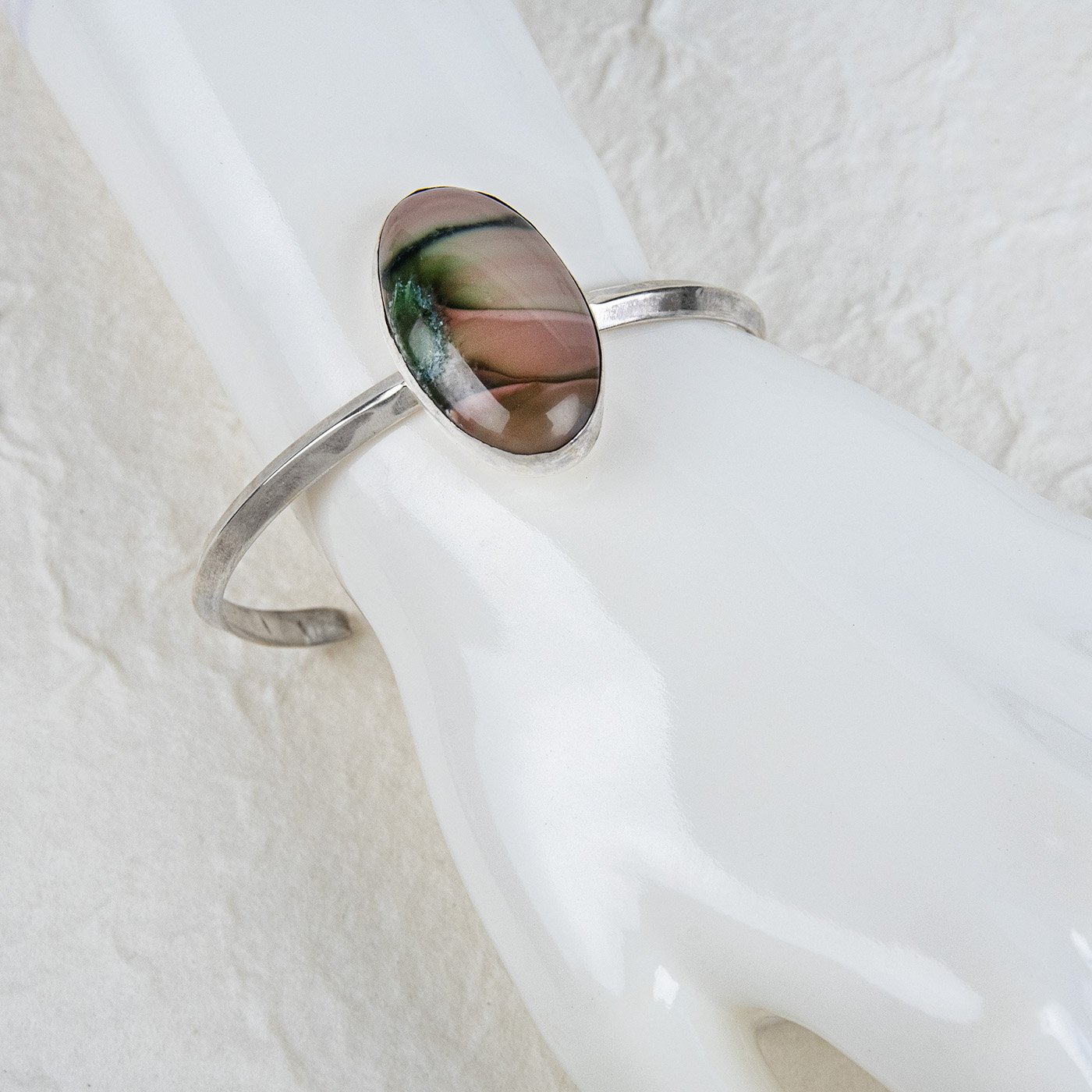 This is a very sturdy sterling silver cuff with an amazing Mookaite Stone that is really comfortable to wear and perfect for the Spring and Summer Season. This bracelet fits a medium to a large wrist and will be sure to be a great accessory to your wardrobe either for casual wear or going out on the town! Handmade one of a kind, one at a time.